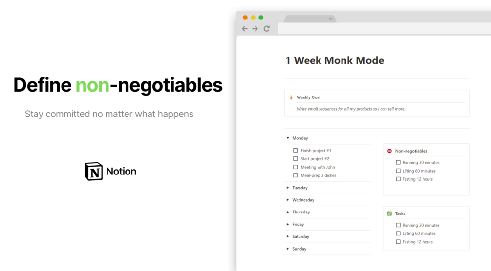 A 1-Week Monk Mode planning template for Notion designed to help you reflect, track and plan your life in a digital all-in-one system.